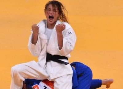 Sarah Menezes comemora vitória sobre a belga Charline van Snick nas semifinais do judô até 48 kg (Foto: Johannes Eisele/AFP)